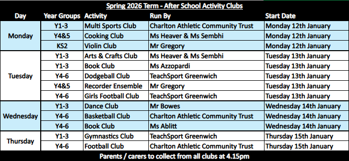 Please find below Spring 2026 term after school activities which start from Monday 12th January 2026: