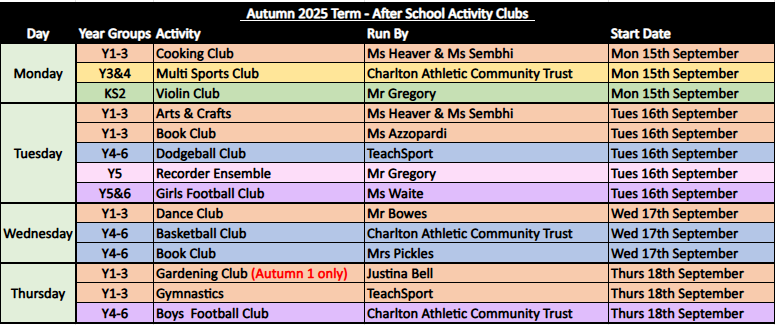 Please find below Autumn 2025 term after school activities which start from Monday 28th April 2025.