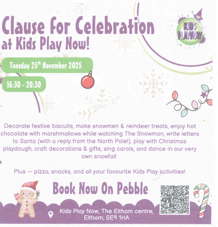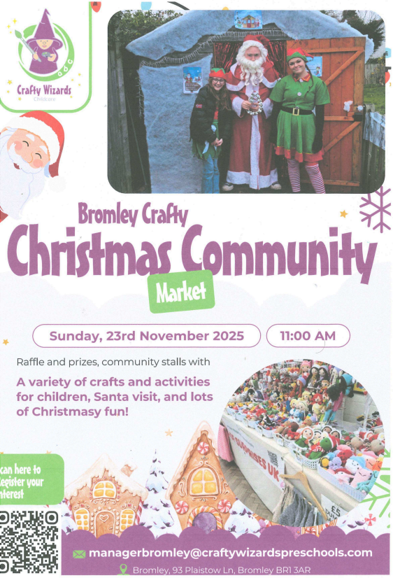 Crafty Wizards Nursery have a couple of exciting Christmas events coming up. Please see below information on their Bromley Christmas Community Market on Sunday 23rd November and their 'Clause for Celebration at Kids Play Now!' event at The Eltham Centre on Tuesday 25th November.