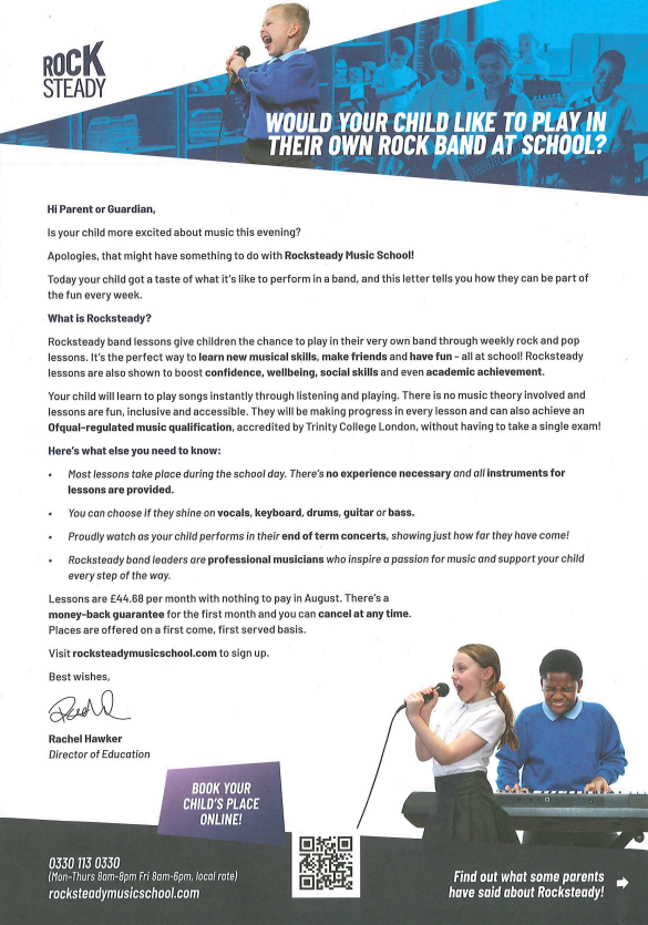 Rocksteady Music School held an assembly in school this week. You can find out more about the rock band lessons that they run in school below and via their website here