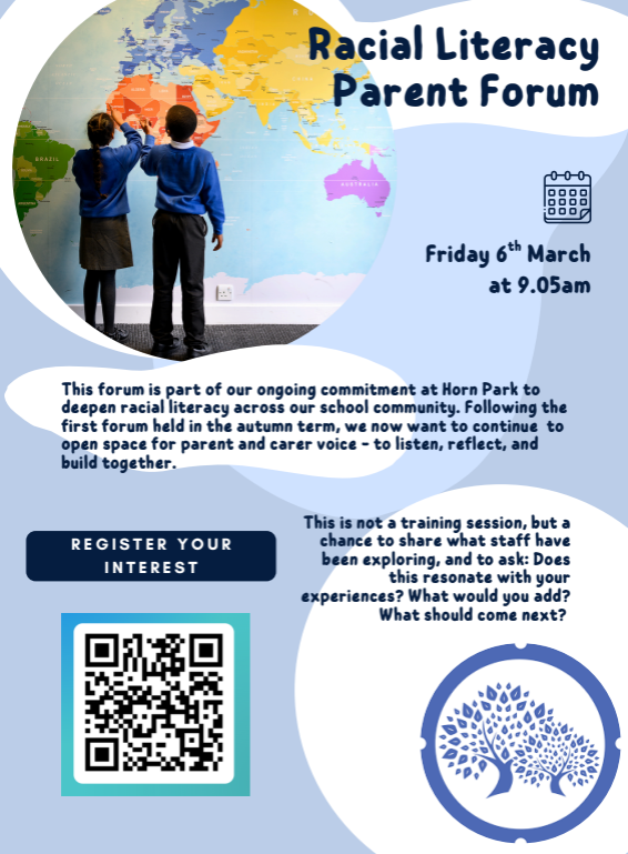 This forum is part of our ongoing commitment at Horn Park to deepen racial literacy across our school community. Following work already underway with staff and our first parent forum group held in the autumn, we now want to continue to provide a space for parent and carer voice - to listen, reflect, and build together.