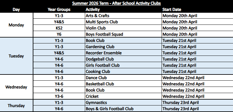 Please see below Summer 2026 term after school activity clubs which start from Monday 20th April 2026: